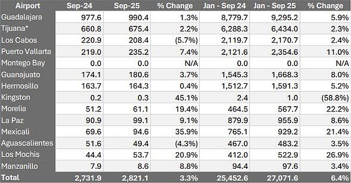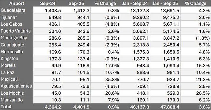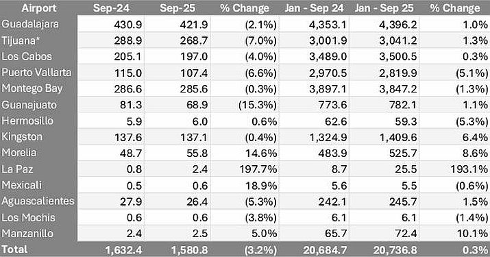 During this period, the total number of terminal passengers at GAP’s 12 Mexican airports increased by 1.0%, compared to September 2024. Puerto Vallarta and Guadalajara airports presented an increase in passenger traffic of 2.6% and 0.3%, respectively, while Los Cabos, Tijuana and Montego Bay airports decreased 4.8%, 0.6%, and 0.3%, respectively, compared to September 2024.
