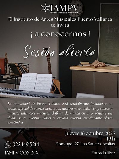 Puerto Vallarta, Mexico – The Instituto de Artes Musicales Puerto Vallarta (IAMPV) is opening new doors for musicians and music lovers alike. On Thursday, October 16 at 7:00 pm, the institute will host an informational session featuring live music to introduce its academic programs at its new headquarters, located at Flamingos 127 in Los Sauces.