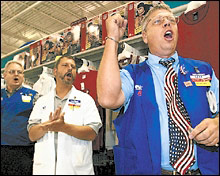 | That Wal-Mart Spirit: Workers at a store in Bentonville, Ark., finish their morning meeting with a corporate cheer. (Photo: Jeff Mitchell/Reuters)