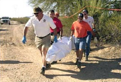| | The body of an undocumented immigrant is removed from the desert east of Sells, Ariz. Some smugglers have coaxed border crossers into taking energizing pills to speed up the journey, but instead, the pills have led to dehydration, heat stroke and death. | Phoenix, AZ - A group that maintains water stations for illegal immigrants crossing the desert plans to distribute maps in Mexico warning about the dangers of crossing the border.