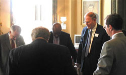| | Senate Democrats have posted this photo on their new web site, "Word to the Faithful." Minority Leader Harry Reid, far left, is shown praying with a group in his office. (Photo: www.senate.democrats.gov) | With his nomination of Judge John G. Roberts, President Bush moved Tuesday to plant the conservative imprint on the Supreme Court that has been a central aim of his presidency, but with a member of the Washington legal establishment designed to frustrate any Democratic effort to block Mr. Bush's replacement for Justice Sandra Day O'Connor.