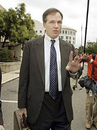 | | Federal prosecutor Patrick Fitzgerald leaves federal court in Washington, October 12, 2005, 2005. (Photo: Charles Dharapak / AP Photo) | The GOP spin: Smear Wilson (again), belittle the charges. The Dems' spin: Bush and his enforcers lied us into war.
