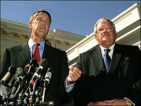 | Two leaders of the US Republican party, Senate Majority leader Bill Frist (L), R-TN, and House Speaker Dennis Hastert, R-IL, speak outside of the White House, September 2005. A recent pollfound that a plurality of Americans, 48 percent, said they would prefer the opposition Democrats to control Congress compared to 39 percent who want Bush's Republicans. (AFP/Jim Watson) | If Dems win in the 2006 and 2008 elections, but fail to define what they stand for, the country will be no better off. Here's how Democrats can again become a great party.