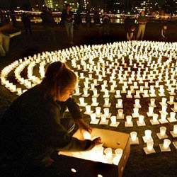| | Kelly Hamlett of Oakland, California, and members and supporters of Veterans for Peace, place candles around Oakland's Lake Merritt in honor of the 2,000 American military casualties in Iraq. (Photo: Ray Chavez / AP) | Protesters across the United States took part in hundreds of vigils and rallies on Wednesday to mark the 2,000th U.S. military death in Iraq, hoping to increase pressure on George W. Bush to start bringing troops home.