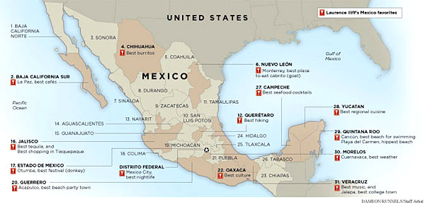 But the most important thing I've learned is that Mexico is always surprising, which makes for great traveling. Here's the Mexico I've come to love.Picking a favorite state is tough, but Michoacán (19 on the map; pronounced mee-choh-wah-KAHN) in central Mexico heads my list for now. It's not, however, so much for the colonial capital, Morelia, with its massive cathedral, or its Indian magic and Day of the Dead celebrations that parallel Halloween.