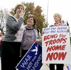 | | Anti Iraq war protester whose son who was killed in Iraq, Cindy Sheehan (L) is accompanied by supporters in front of the U.S. Federal Court before she reports for her court date in Washington, November 16, 2005. (Larry Downing/Reuters) | Washington - Iraq War protester Cindy Sheehan and 26 other peace activists were found guilty Thursday of protesting without a permit near the White House.