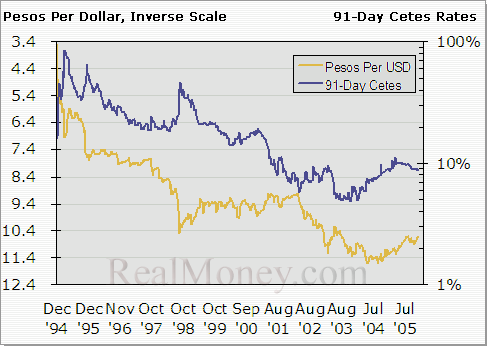 Peso Moves Higher Even As Cetes Rates Fall  Source: Bloomberg  Those who confuse wider interest rate gaps with a stronger currency should take heed. The peso has increased 7.38% against the dollar since August 2004. While some Mexican manufacturers, particularly those located in the maquiladora region near the U.S. border, may lament the stronger peso, it is an unalloyed boon to Pedro Juan (the Mexican counterpart to Joe Six-Pack). Mexico's competition as an exporter to the U.S. lies across the Pacific in China, and just as there is no yuan level that would make American labor cost-competitive with Chinese labor, there is no yuan level that would allow Mexico to win a price war with China, either. Competitive devaluation never works.