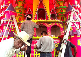 | | Alfredo Reyes helps prepare a Santa scene in hopes of attracting celebrating families. Some vendors say attendance has fallen off at the Revolution monument location. |