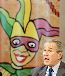 | | President Bush made his first trip to New Orleans in three months on Thursday and declared that it was "a heck of a place to bring your family" and that it had "some of the greatest food in the world and some wonderful fun." (AP) | War, trials, leakers, investigations, packed courts, and a constitutional crisis.