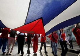 | Cubans carry a giant national flag during a protest march past the U.S. diplomatic mission in Havana January 24, 2006. Cuban President Fidel Castro had called out for the march in protest of a ticker that streams news and human rights messages across the mission's windows. Castro also denounced Bush's government of harboring Luis Posada Carriles, a Cuban-born former CIA operative who is wanted by Cuba and Venezuela for the blowing up of a Cuban airliner in 1976. (Reuters/Claudia Daut)