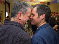 | | Christopher Johnson (left) and Ken Repp celebrate the one-year anniversary of legalized same-sex marriage in Massachusetts, which allowed them to wed. A case now before the state's highest court seeks marriage rights for non-resident gay couples. (Darren McCollester/Getty) | Supporters of legalizing same-sex marriage have largely eschewed a federal battle, choosing instead to focus their efforts on a case-by-case basis in state courts around the country. Challenges are largely based on the argument that barring same-sex unions violates equal protection and due process guarantees in state constitutions. Below, a look at how these challenges are playing out in several states: