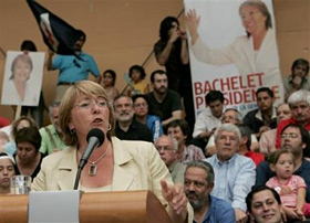 | | Presidential candidate Michelle Bachelet of the Socialist party, speaks during her campaign rally in Santiago, Chile, Saturday. The second round presidential election is scheduled for Jan. 15. (AP/Santiago Llanquin) | Santiago de Chile - More relaxed but cautious, pro-government candidate Michelle Bachelet enters Monday the last week of the Chilean presidential campaign before the January 15 polling, leading the electoral race against opponent Sebastian Pinera.