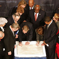 | | House and Senate Democrats gather at the Library of Congress to offer more restrictive measures to regulate lobbying than Republicans proposed. (Michael Robinson Chavez/Washington Post) | The Bush administration appears to have violated the National Security Act by limiting its briefings about a warrantless domestic eavesdropping program to congressional leaders, according to a memo from Congress's research arm released yesterday.