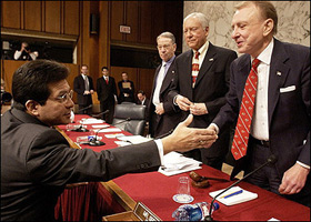 | | US Attorney General Alberto Gonzales greets senators including (R-L) Senate Judiciary Committe Chairman Arlen Specter, R-PA, Orin Hatch, R-UT, and Chuck Grassley, R-IA, before testifying in front of the Senate Judiciary Committee in the Hart Senate Office Building on Capitol Hill in Washington, DC. (AFP/Mandel Ngan) | The Republican who chairs the Senate Judiciary Committee said today that he believed the Bush administration had violated the law with its warrantless surveillance program and that its legal justifications for the program were "strained and unrealistic."
