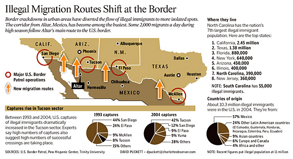 Border crackdowns in California and Texas have diverted the stream of migrants to this menacing but less-monitored terrain. Nearly 1,000 of them have died in the Arizona desert since 2000 from dehydration, injuries and illness and clashes with authorities, smugglers and thieves.
