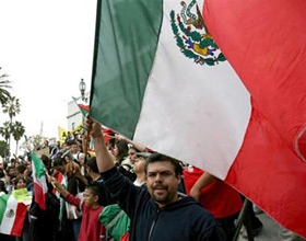 | | A demonstrator waves the Mexican flag at Los Angeles City Hall to protest against house bill HR4437, which would toughen immigration laws, in Los Angeles. (Max Morse/Reuters) | Bill proposing crackdown spurs grass-roots movement.
