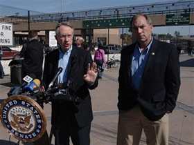 | | Senator Harry Reid, D-Nev., left, talks about immigration issues as Las Vegas Metro Police Sheriff Bill Young, right, looks on during a news conference as cars and pedestrians head into Mexico at the San Ysidro Port of Entry in San Diego Wednesday, March, 22, 2006. (AP/Denis Poroy) | Mexico City – Mexico said this week it is optimistic that a major breakthrough granting legal status to some of the millions of its undocumented citizens in the United States could be on the way.