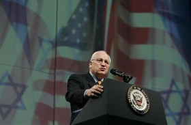 | | Vice President Dick Cheney delivers his remarks to the American Israel Public Affairs Committee in Washington. Cheney said Tuesday that Iran will not be allowed to have a nuclear weapon and warned 'the United States is keeping all options on the table in addressing the irresponsible conduct of the regime.' (AP/Manuel Balce Ceneta) | According to a CBS News poll released last Monday, the "favorability" rating of Vice-President Dick Cheney has sunk to a new low. How low a low? Well, that evening, Jon Stewart, as part of the buildup to the "Daily Show" star's going global on Oscar Sunday, was the guest on CNN's "Larry King Live." When King barked out the number - "Cheney eighteen per cent" - Stewart, citing another well-known poll result, observed solemnly, "Four out of five dentists surveyed recommend sugarless gum for their patients who chew gum." That is, the proportion of Americans who have a favorable opinion of Cheney is outweighed by the proportion of dentists who recommend sugary gum for their patients who chew gum.