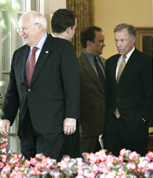 | | Vice President Cheney "specifically directed" his then-top aide, I. Lewis "Scooter" Libby, far right, to tell reporters about a 2002 report that Iraq had tried to buy uranium from Niger, according to prosecutor Patrick J. Fitzgerald. (Jason Reed/Reuters) | In early June 2003, Vice President Dick Cheney met with President Bush and told him that CIA officer Valerie Plame Wilson was the wife of Iraq war critic Joseph Wilson and that she was responsible for sending him on a fact-finding mission to Niger to check out reports about Iraq's attempt to purchase uranium from the African country, according to current and former White House officials and attorneys close to the investigation to determine who revealed Plame-Wilson's undercover status to the media.