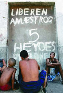| | Cubans sit under a graffiti that reads "Free our five heroes" in Havana. | Here, a new trial was mandated by the perfect storm created when the surge of pervasive community sentiment, and extensive publicity both before and during the trial, merged with the improper prosecutorial references. - Eleventh Circuit US Court of Appeals, three-judge panel opinion reversing the convictions of the Cuban Five, August 9, 2005