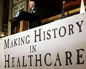 | | U.S. Senator Edward Kennedy (D-MA) speaks at a signing ceremony for a healthcare reform bill for the Commonwealth of Massachusetts at Faneuil Hall in Boston April 12, 2006. The bill attempts to provide health insurance for all Massachusetts residents. (Reuters/Brian Snyder | i>Law could hurt the state's poorest.