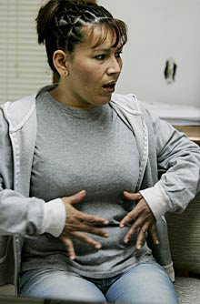 | | "The man said, 'Put on this band,'" Félix said, showing how she fitted the drugs to her body. "I didn't know it was heroin until I was arrested." She is serving a 10 1/2-year sentence at La Mesa. (Peggy Peattie/Union-Tribune) |