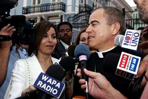 | | San Juan Archbishop Monsignor Roberto Gonzalez Nieves (R) talks to the media at his arrival to the special commission meeting in the Governor's mansion in San Juan, Puerto Rico, May 10, 2006. Archbishop Gonzalez originated the idea of the special consensus commission to find a way to end a partial government shutdown that has left about 95,000 public workers in the streets. (Reuters/Ana Martinez | This dependency's paralysis provokes little response in the United States.