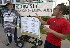 | | Amnesty opponent Wesley Baugh (L) argues with pro-immigration demonstrator Isaac Herrera during a planned protest near downtown San Diego, California May 1, 2006. In what organizers called 'A Day Without Immigrants,' rallies across the country closed hundreds of restaurants, shops and factories. (Reuters/Fred Greaves) | While a series of marches focused much of the nation's attention on the plight of illegal immigrants, scores of other Americans quietly seethed. Now, with the same full-throated cry expressed by those in the country illegally, they are shouting back.