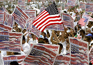 Influential figures, including Spanish-language radio DJ Eddie "El Piolin" Sotelo, urged downtown demonstrators to become U.S. citizens, a suggestion greeted with roars of approval.
