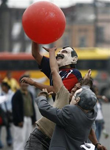| | A man wearing a mask of Mexican President Vicente Fox fights for the ball during a game between the U.S.A. team, represented by men wearing masks of politicians belonging to the ruling National Action Party (PAN) against the Mexico team, represented by men wearing masks of politicians belonging to the leftist Democratic Revolution Party in Mexico City, Mexico on Thursday June 1, 2006. The Mexico team beat the U.S.A. team by 8-4. (AP/Dario Lopez-Mills) | A new coalition of American Hispanic Americans opposed to the US Senate's illegal alien amnesty is condemning Mexican President Vicente Fox's overt effort to meddle in the internal affairs of the United States and exert influence over US immigration policies. The Mexican president went on a tour of US Western states, during which he openly lobbied for passage of an illegal alien amnesty and guest worker program.
