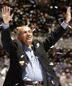 | | Mexican presidential candidate Felipe Calderon waves as he arrives at his last rally in the country's capital, Mexico City, at the Aztec Stadium on Sunday June 25, 2006. Next July 2, Mexico will hold presidential elections. (AP Photo/Dario Lopez-Mills) | Leftist presidential hopeful Andres Manuel Lopez Obrador doesn't speak English, rarely travels outside Mexico and says the best foreign policy is to stay at home and avoid meddling in other nations' affairs.