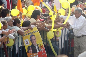 | | Presidential candidate Andres Manuel Lopez Obrador of the Democratic Revolution Party, PRD, greets supporters during a rally in the city of Puebla, Mexico on Tuesday June 20, 2006. On July 2, Mexico will hold presidential elections. (AP/Joel Merino) | Uneasy at election victories by leftists in Latin America, the United States may soon feel the region's wave of change lapping up against its southern border if a former indigenous welfare officer wins Mexico's presidential election on July 2.