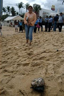 | | A police forensic agent stands next to a head that washed up on the beach in Acapulco, Mexico on Wednesday June 7, 2006. The gruesome discovery came a short distance from high-rise hotels and open-air discotheques that line Condesa Beach, which flanks Acapulco's touristy Avenida Costera boardwalk. (AP/Gonzalo Perez) | Acapulco, Mexico, is a popular beach resort that draws tens of thousands of U.S. tourists each year. But as CBS News correspondent Bill Whitaker reports, the streets of Acapulco and other cities near the U.S. border look more like a war zone these days, as drug cartel gangsters with grenades and high-powered assault weapons battle for control of smuggling routes to the lucrative U.S. market. Nowhere is the fighting worse than the small border city, Nuevo Laredo — just a stone's throw across the Rio Grande from Laredo, Texas.