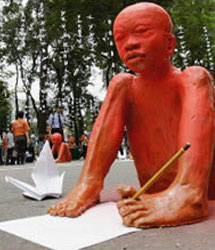 | | Sculptural works by Vietnamese students represent disabled child victims of the defoliant Agent Orange - containing the lethal chemical dioxin - which the US sprayed widely during the Vietnam war. The US told Vietnamese officials yesterday that it won't compensate Vietnam's Agent Orange victims. (AFP) | The United States won't compensate Vietnam's Agent Orange victims but will offer advice on dealing with the wartime defoliant, a US official said during a visit by Defense Secretary Donald Rumsfeld.