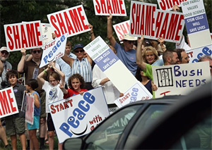 | | Protesters wave placards against the appearance of President George Bush as traffic passes on Hampden Avenue in southeast Denver, Friday, July 21, 2006. Bush attended a private luncheon for a Republican candidate for Colorado's 7th District Congressional seat in a nearby suburb. (AP/David Zalubowski) | Cedar Rapids, Iowa - When school was canceled to accommodate a campaign visit by President Bush, the two 55-year-old teachers reckoned the time was ripe to voice their simmering discontent with the administration's policies.