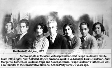 Calderon's father was among the many who took up arms in defense of the church, and it was that sense of persecution that led him in 1939 to join with other conservative Catholics to found the National Action Party, or PAN in its Spanish initials, the party whose banner Calderon appears to have carried to victory.