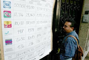 | | A man looks at the final tally of votes on a public announcement poster placed outside a district office of the federal electoral institute in Mexico City July 12, 2006. (Tomas Bravo/Reuters) | Several thousand Mexican leftists marched on the capital on Wednesday to protest what they say was vote fraud in a presidential election that has divided the nation between left and right.