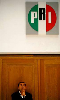 | | A security guard gestures under the symbol of the Institutional Revolutionary Party (PRI) inside the headquarters in Mexico City July 7, 2006. The PRI suffered a shattering defeat in the national elections on Sunday, dealing a severe blow to the party that ruled Mexico for 71 years. (Reuters/Daniel LeClair) | It is really new for Congress to be more than just a rubber stamp. Whether the slim win of conservative Felipe Calderon is certified by an electoral court or leftist leader Andres Manuel Lopez Obrador ends up ahead after his legal challenge runs its course, Mexico's disputed July 2 election has already become a tale of a polarized nation split along regional, class, and, now, party lines.