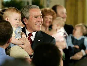 | | U.S. President George W. Bush holds Trey Jones, 1, of Cypress, Texas, after speaking out against federally-funded stem-cell research during an event at the White House in Washington. Bush on Wednesday used his first veto to block legislation expanding embryonic stem cell research. Jones, along with many other children onstage with the President, was conceived from frozen embryos. (Jason Reed/Reuters) | But only 128 "snowflakes" have been adopted. Will the stem-cell veto hurt the GOP?