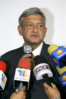 | | Mexican presidential candidate Andres Manuel Lopez Obrador, of the Democratic Revolution Party, (PRD), listen during a press conference in Mexico City, Mexico, Monday, July 3, 2006. Obrador said Monday he will use all legal means to challenge the apparent electoral victory of his conservative rival, Felipe Calderon. (AP/Eduardo Verdugo) | Mexico's young democracy faced its greatest test yet Monday as the pro-business Felipe Calderon declared himself president-elect with a 400,000-vote advantage. His leftist rival alleged ballot irregularities and pledged to use all "legal means" to challenge the apparent outcome.
