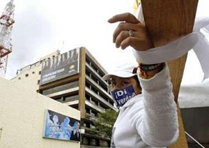 | | A supporter of Mexican presidential candidate Andres Manuel Lopez Obrador of the Democratic Revolutionary Party (PRD), hangs from a wooden cross during a demonstration in front of Mexico's Televisa network in Mexico City July 21, 2006. (Reuters/Henry Romero) | Mexico City - Street cleaners throwing bagfuls of their own blood at the doors of the Senate, potbellied farmers marching naked through the financial district - such street theater is now the norm in Mexico, where citizens long ago learned to separate political rhetoric from reality.