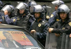 | | Anti-riot police stand guard near a Mexican congress in Mexico City August 14, 2006. The protesters demanded a full recount of ballots from the July 2 general elections. (Reuters/Daniel Aguilar) | Mexico City - A potentially dangerous confrontation between the Mexican army and thousands of protesters loomed larger Tuesday as federal officials insisted on holding annual Independence Day celebrations on the same streets occupied for weeks by supporters of the leftist presidential candidate.