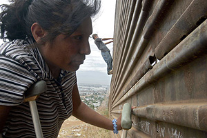 | | "This is where my dreams ended," says Mari Paz, as she peers at the United States from Mexico as a boy looks for the Border Patrol. She has failed several crossing attempts.