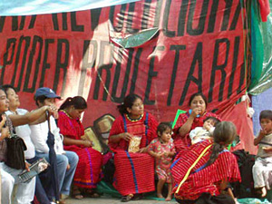| | Triqui women in the Oaxaca zocalo. (Nancy Davies) | José Jiménez Colmenares, a mechanic by profession married to teacher, was shot in the street while participating in a march organized by the Popular Assembly of the People of Oaxaca (APPO, by its Spanish initials) on August 10. Two others were wounded. At the front of the march the empty wheel chair belonging to German Mendoza Nube – the Union of Poor Campesinos founder and APPO leader who was arrested on August 9 – was pushed, with his photo on the back of the chair.