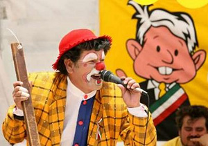 | | A clown who is a supporter of Andres Manuel Lopez Obrador, presidential candidate of the Democratic Revolutionary Party (PRD), performs outside Mexico's Federal Electoral Tribunal (TRIFE) building in Mexico City. (Reuters/Daniel Aguilar) | "We could be here for years if the circumstances merit it." -Andres Manuel Lopez Obrador