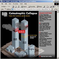| | A graphic illustration, from the USA Today newspaper web site, of the World Trade Center points of impact. Click on the image above to access the actual USA Today feature. | Kevin Barrett believes the U.S government might have destroyed the World Trade Center. Steven Jones is researching what he calls evidence that the twin towers were brought down by explosives detonated inside them, not by hijacked airliners.