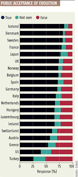 Religious fundamentalism, bitter partisan politics and poor science education have all contributed to this denial of evolution in the US, says Jon Miller of Michigan State University in East Lansing, who conducted the survey with his colleagues. "The US is the only country in which [the teaching of evolution] has been politicised," he says. "Republicans have clearly adopted this as one of their wedge issues. In most of the world, this is a non-issue."