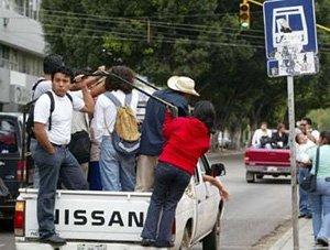 | | Commuters ride a pick-up truck past a bus stop during a strike in Oaxaca August 29, 2006. Shops and restaurants were shut and buses did not run during the 24-hour stoppage to demand an end to violent clashes. (Reuters/Stringer) | In Mexico city, an illegal tent city blocks banks, businesses and traffic here as hundreds of federal police and soldiers brace for a showdown with leftist demonstrators.
