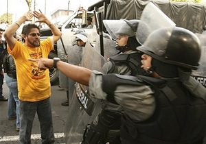 | | Riot police prevent supporters of Mexican presidential candidate Andres Manuel Lopez Obrador from getting to the National Congress in Mexico City, Monday Aug. 14, 2006. Hundreds of supporters of Lopez Obrador, demanding a vote by vote recount of the past July 2 elections, clashed with police outside Mexico's Congress, as the nation's top electoral court met to resolve election disputes. (AP/Dario Lopez-Mills) | Mexican riot police used tear gas and clubs to drive back leftist legislators and supporters protesting outside Congress on Monday in the first violent clash over a fiercely contested presidential election.