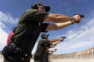 | | Trainee Eleazar Velazquez (foreground) takes part in his first day on the firing range with other members of Class 628 at the U.S. Border Patrol Training Academy in Artesia, New Mexico. Elite U.S. Border Patrol units armed with assault rifles and stun grenades may be set to play a more prominent role as authorities gain greater control over the porous border with Mexico, border police say. (Reuters/Jeff Topping) | Yuma, Ariz. - Federal authorities are investigating the fatal shooting of a Mexican man who allegedly threw rocks at Border Patrol agents from the Mexican side of the border.